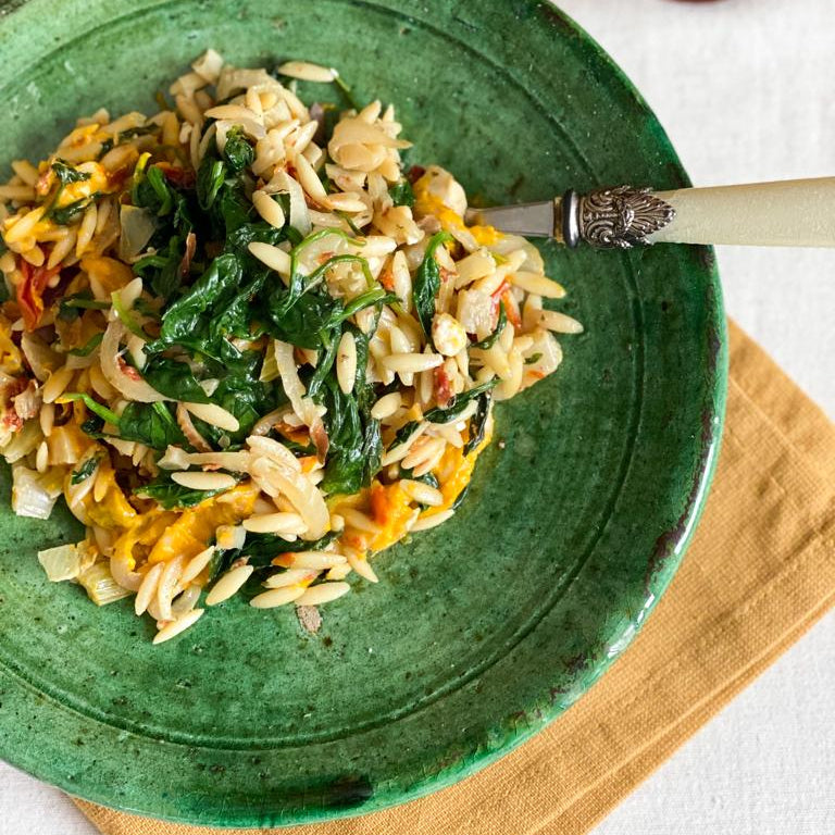 Gratin de pâtes au potiron, lardons, épinards & sauce butternut